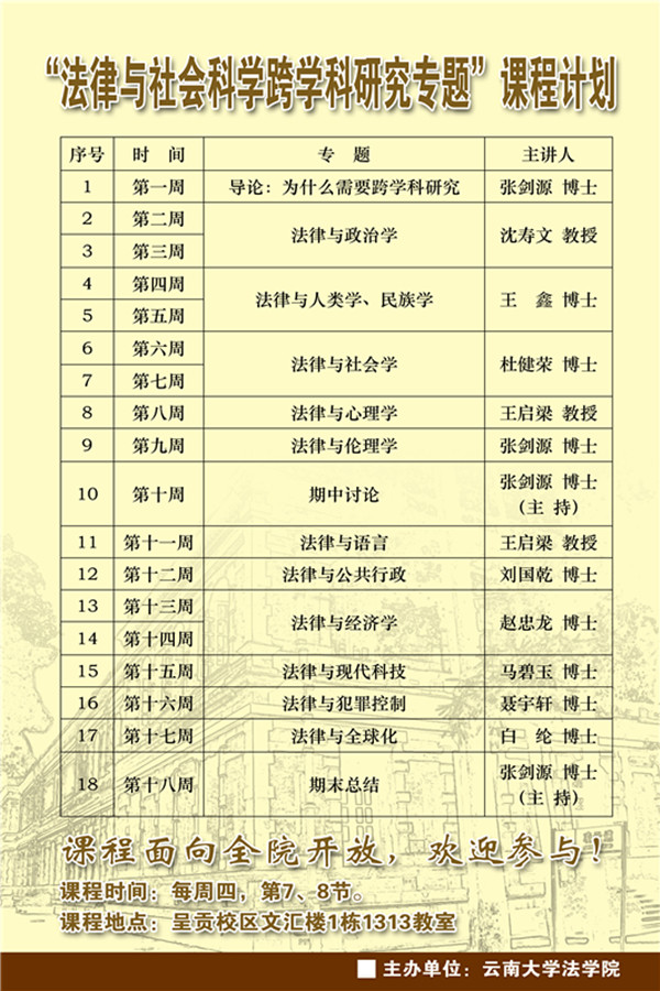 云南大学法学院地址:昆明市呈贡区大学城云南大学(呈贡校区)法学楼邮件:lawschool@ynu.edu.cn电话:65033171(党政办),65935848(学工办、团委),65036550(教务办),65033627(研究生办),65031120(培训中心)位置:点击查看技术支持:云南大学信息技术中心