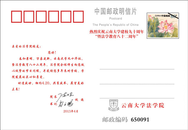 ——热烈庆祝云南大学九十华诞邮政贺卡。