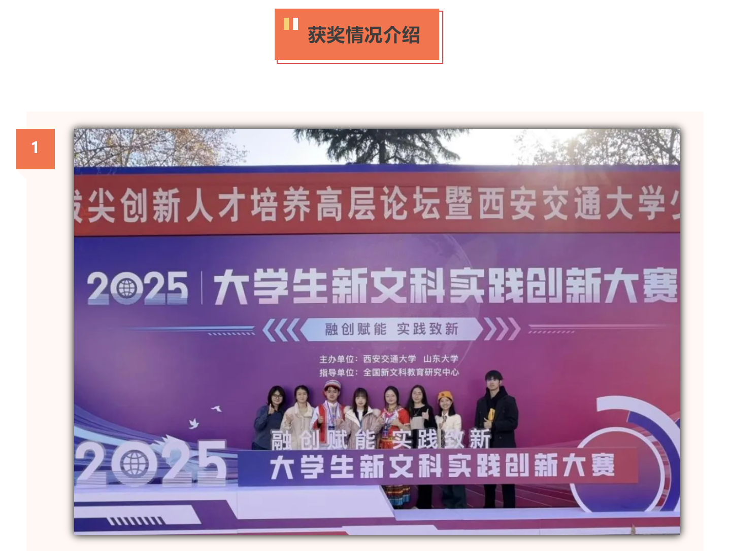 近日,“2025年大学生新文科实践创新大赛”全国总决赛在西安交通大学圆满落幕。法学院师生表现优异,共斩获国家级金奖2项、银奖1项,指导老师徐清荣获“优秀指导教师奖”。