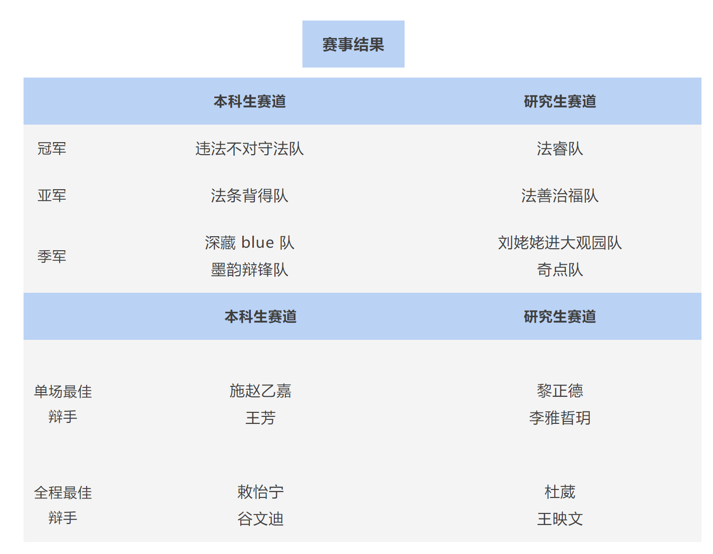 研究生赛道辩题为“营救式刑求是否是可采取的手段”。 正方以法理结构搭建论证框架,提出“营救式刑求”具备正当防卫与紧急避险的核心正当性。他们主张,如将其法定化、程序化,可最大程度降低滥用风险,并在极端情形下实现“以最小侵害换取最大救援”的正义价值。 反方则从人权保障入手,提出营救式刑求违反我国现行刑诉法原则,也违背国际反酷刑规范。反方强调:“以不正义手段应对非法行为,会导致法治退步”,并结合心理学研究指出高压审讯的“信息无效性”,在实践上也难以达成营救目的。 双方在攻辩与自由辩中屡次交锋:正方要求反方给出在紧急情境下“无损害但有效”的替代方案;反方则反击正方的制度假设过于理想化,指出其难以与现实司法运行衔接。双方论证缜密、节奏紧凑,现场氛围紧张到让观众屏息。 最终,反方凭借更稳健的法治立场与制度论证获得冠军。 反方三辩杜葳、正方四辩王映文获得研究生赛道“全程最佳辩手”。