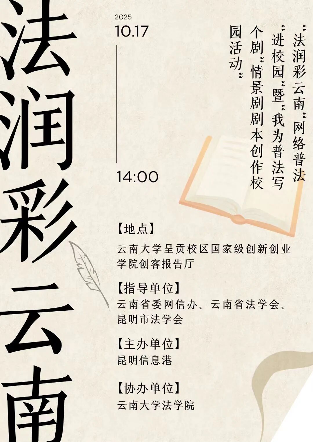 本活动由云南省委网信办、云南省法学会、昆明市法学会指导,昆明信息港主办,云南大学法学院协办