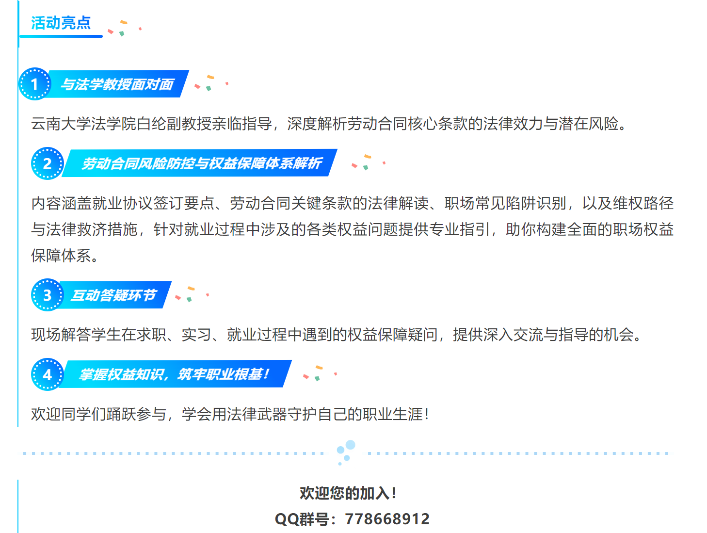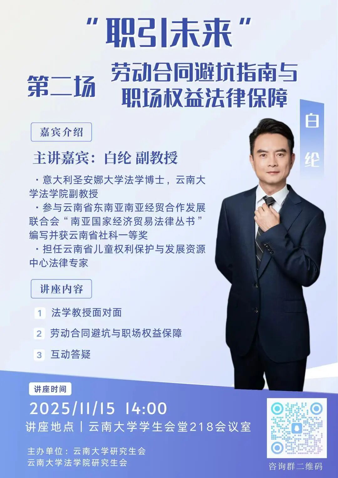 “职引未来” 法律就业服务项目由云南大学研究生会与法学院研究生会联合牵头打造,切实帮助云南大学学子明晰职业方向、提升就业竞争力,同时强化学生在就业过程中的权利保障意识。 本期“职引未来”讲座邀请到了云南大学法学院副教授白纶老师,开展《劳动合同避坑指南与职场权益法律保障》讲座。讲座内容系统覆盖从职业规划、劳动合同签订到职场权益保障的全流程,聚焦劳动关系中常见的法律争议与风险点,结合当前就业形势与热点问题,以专业的视角解析劳动合同条款、识别职场陷阱、阐明维权路径,致力于为学生构建坚实的劳动法律知识体系,有效提升就业风险防范能力,为未来职业发展筑牢法律基础。