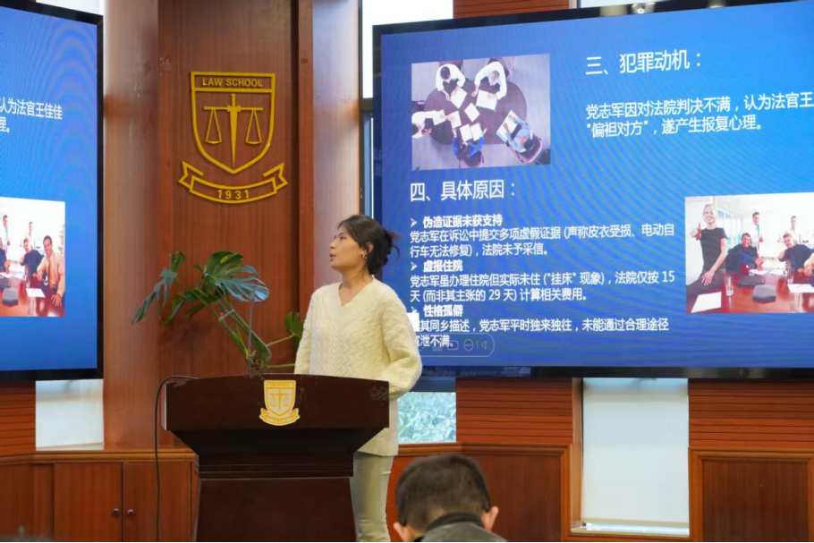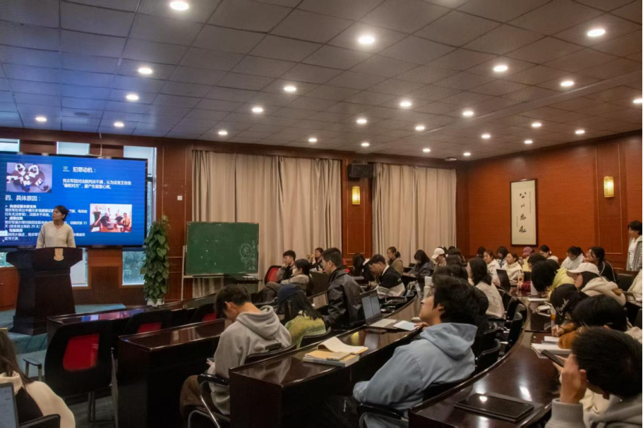 紧接着,活动聚焦于引发社会广泛关注的“河南女法官遇害案”。李星瑶、阿伊夏和宋雨婷三位同学通过对案情始末的细致复盘,引导大家审视该案背后的法律焦点:从民事诉讼的证据与事实争议,到刑事案件涉及的法理探讨与舆论反应,多维度解析了案件的判定依据。三位同学一致认为,司法是维护社会正义的最后一道防线,任何针对司法人员的暴力行为都是对法治底线的公然挑战。她们倡议,全社会应持续强化普法教育,增强法治信仰,同时制度层面须进一步健全司法人员安全保障体系,确保每一位法律捍卫者都能在安全的环境下守护正义。
