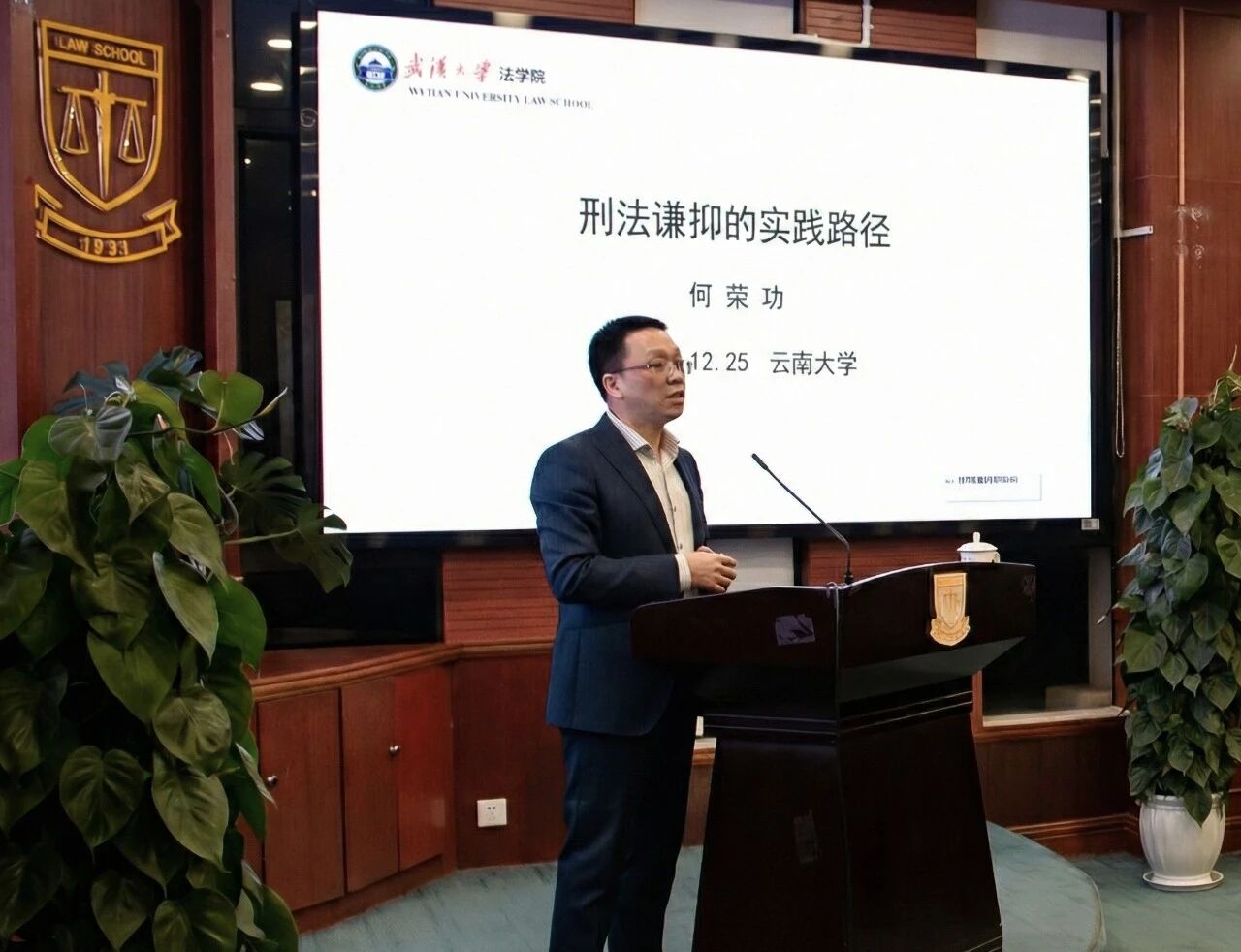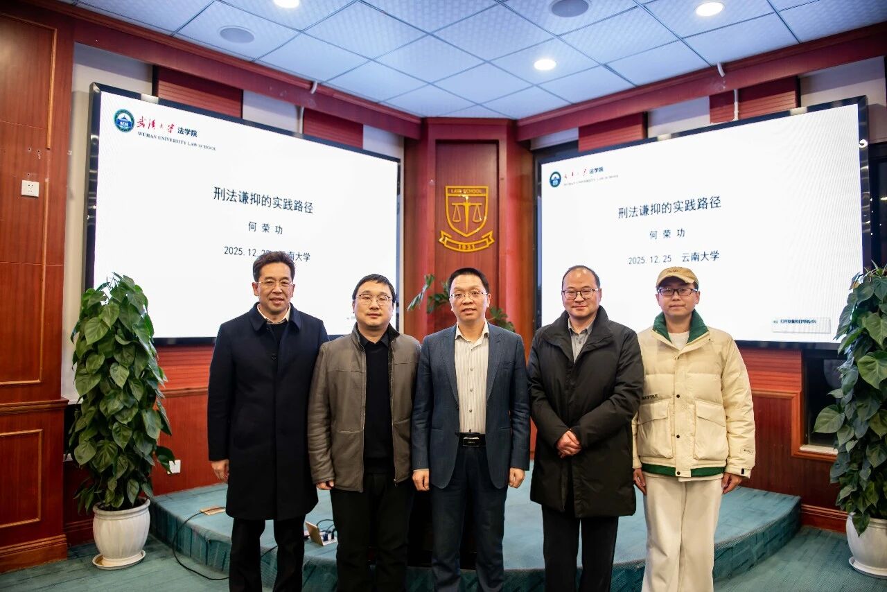 2025年12月25日晚,云南大学法学院明法讲坛第一百五十二期于法学院国际报告厅成功举办。本次讲座特别邀请到中国刑法学研究会副会长、武汉大学法学院教授何荣功担任主讲人,主题是“刑法谦抑的实践路径”。南京大学法学院副教授黄旭巍、云南睿信律师事务所主任杨俭担任与谈人。讲座由云南大学法学院教授赵春玉主持。