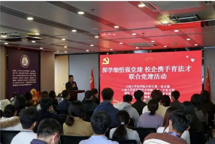 为进一步强化党建引领效能,推动校企协同育人模式走深走实,凝聚法治人才培育的强大合力,2026年3月13日下午,我院与建纬(昆明)律师事务所联合举办“深学细悟强党建 校企携手育法才”主题党建活动。活动由该事务所党总支副书记罗华主持,我院党委副书记、纪委书记周桐,该事务所党总支书记卞子增、行政总监伍汉霞,以及双方党支部党员代表、我院学生代表齐聚一堂,共同参与此次共建活动。