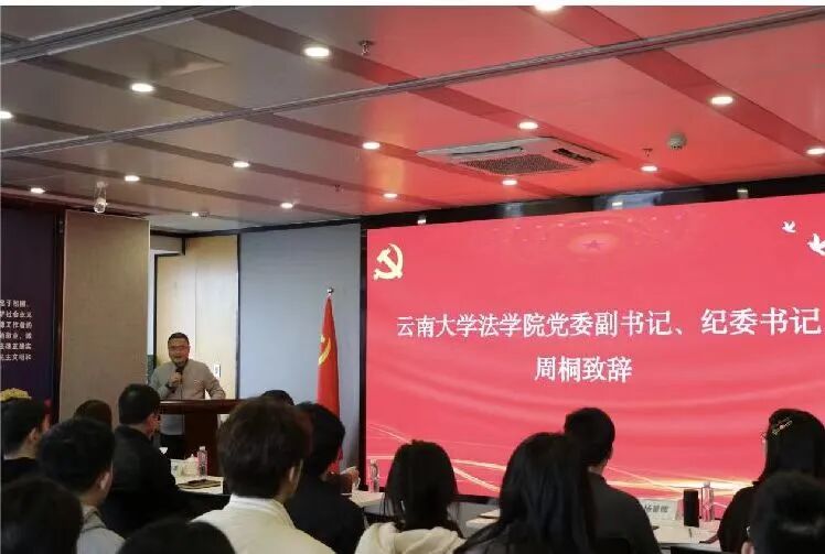 活动开场,我院党委副书记、纪委书记周桐发表致辞。他代表学院党委,向连续五年鼎力支持并赞助“建纬杯”新生辩论赛的建纬(昆明)律师事务所致以衷心谢意。他强调,“建纬杯”新生辩论赛不仅是我院新生接触专业实践、提升思辨能力的启蒙平台,更是打通高校法学教育与法律实务壁垒的关键纽带,生动彰显了该律所的社会担当与党建工作的引领示范成效。他表示,此次活动从以往的交流学习升级为支部共建,标志着我院与该律所的合作迈入全新阶段,是党建引领下校企协同育人的生动实践,旨在通过双方资源互补、优势联动,使我院青年党员在实务实践中锤炼党性修养、提升专业素养。他勉励我院同学们珍惜此次学习契机,以辩促学、以学践知、以行践诺,期待双方携手打造党建共建标杆,共同培育适应新时代需求的高素质法治人才。